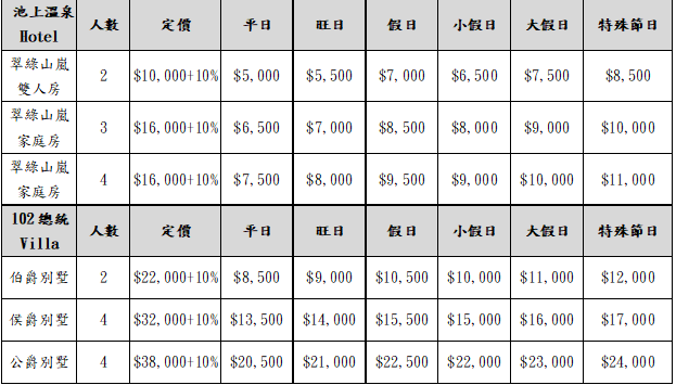 - 別墅區加人費$1,100+10%/人,包含精緻早餐