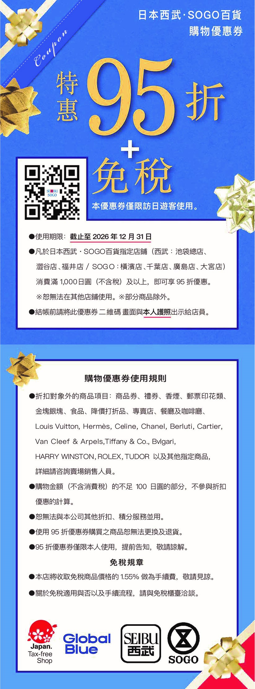 - 退稅優惠10%:持非日本護照購物且入境日本不超過6個月,可享退稅優惠,詳情請至各店免稅櫃檯、官方網站或日本政府觀光局相關網站查詢。部分商品之消費稅為8%。免稅相關規範詳情請洽各店現場人員。
